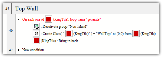 So at this point, we are able to determine which mask should be created. Now we simply need to dynamically create the actual mask! If you are using Multimedia Fusion 2, you must use the Create By Name extension. If you are using Clickteam Fusion, you can use the Create By Name extension or the default Create object. In each group you need create the mask of that corresponds to the group centered on the originating tile. In the below example, all Top Wall masks end with "WallTop." When this group is activated during runtime, the active named "WallTop" will be created and should be centered on the originating tile. Apply this action across each group to complete the mask creation progress.